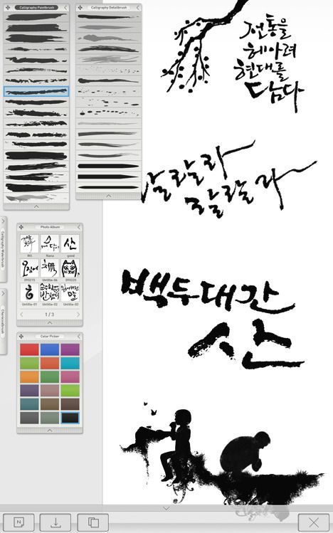 독특하게도 이 제품은 스타일러스 펜 대신 스타일러스 붓을 준다. 4가지 붓의 유형을 선택하고 화면에 그려나가면 디스플레이에는 마치 붓에 먹을 묻혀 써내려가는 듯한 표현이 가능하고 붓의 움직임이나 속도에 맞춰 선의 굵기도 달라져서 표현하고자 하는 느낌을 전달하기가 쉽다. 먹을 갈거나 염료를 만들 필요도 없이 검은색 뿐 아니라 다양한 컬러를 터치 한번으로 바꿀 수 있으며, 잘못썼다고 해서 종이를 바꿀 필요도, 다시 쓴다고 해서 다른 종이를 꺼내 들고올 필요도 없다. 그냥 원하는 파일명으로 저장만 하고 다시 쓰면 된다. 왠지 모르게 이 타블렛만 있으면 저정도의 작품은 뚝딱 만들어 낼 것 같은 몹쓸 자신감이 생긴다.
