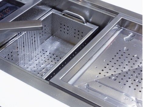 스테인리스 스틸로 만들어진 이 싱크대의 가장 큰 매력은 바로 측면에서 흘러나오는 물줄기다. 지속적으로 흘러나오게 해서 청소를 하거나 혹은 야채 등을 다듬을때 깔끔하게 작업이 가능하다. 만약 흘러내려오는 물줄기보다 강한 능력을 원한다면 충분히 길게 연결된 분사기를 사용해 원하는 곳에 대면 된다. 특히 매끈하게 처리된 싱크는 다양한 채소나 과일, 생선등을 손보기에 편리하도록 넓게 되어 있어 좋다. 특히 흐르는 물줄기와 분사기를 이용해서 야채나 과일의 물기를 빼낼 수도 있도록 별도의 통이 만들어져 있다는 점과 옵션으로 구성된 좀 더 깊은 타공 싱크를 구입하면 물기를 더 편리하게 제거하며 손질이 가능하게 되어 있다는 점이 편리하다. 이 앞에서 야채를 다듬고 생선을 손질하고 있으면 이미 전문가가 된 것 같은 느낌이 들 듯 하다.