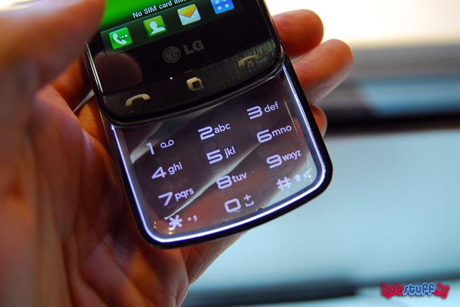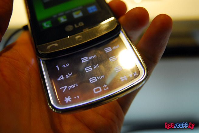 이 제품이 바로 투명키패드폰 LG GD900의 모습입니다. 전체적인 라인은 마치 샤인폰 같기도 하고 그렇습니다. 슬라이드 방식의 키패드가 장착되어 있고 모서리에는 도금된 프레임으로 구성되어 있습니다. 화면은 밝고 선명하며, 아래쪽에는 백라이팅이 되는 3가지 터치버튼이 위치해 있습니다.