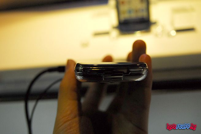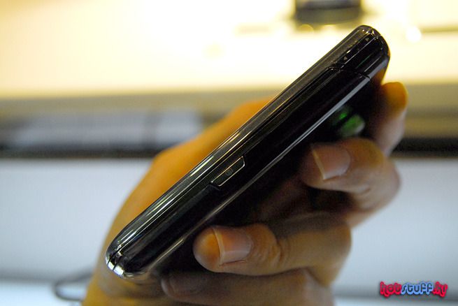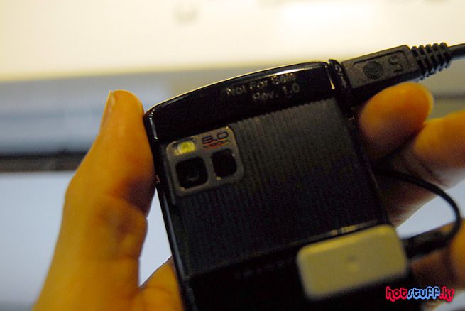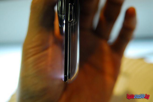 측면부를 돌려봤습니다. 여타 휴대폰에서 보는 것 처럼 카메라 버튼이나 전원 및 홀드 버튼, 배터리 커버오픈 버튼 등이 위치해 있음을 볼 수 있습니다. 투명키패드를 위한 하우징 때문인지 여타 휴대폰처럼 아주 슬림한 외관을 자랑하기 보다 적당한 볼륨감과 그립감을 추구하는 폰의 느낌입니다.
