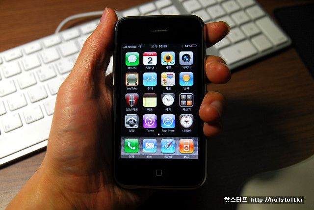 아이폰의 메인화면입니다. 워낙 많은 휴대폰이나 스마트폰들이 벤치마킹하고 튜닝을 거듭해 아이폰스러운 화면을 만들어왔기에 이제는 그리 새롭지도 않지만, 오리지널리티를 사용해볼 수 있다는 점은 매력이 아닐까 싶습니다. 아이팟 터치와 달리 전화라든지 메세지, 카메라, 나침반 등의 아이콘이 눈에 띕니다.