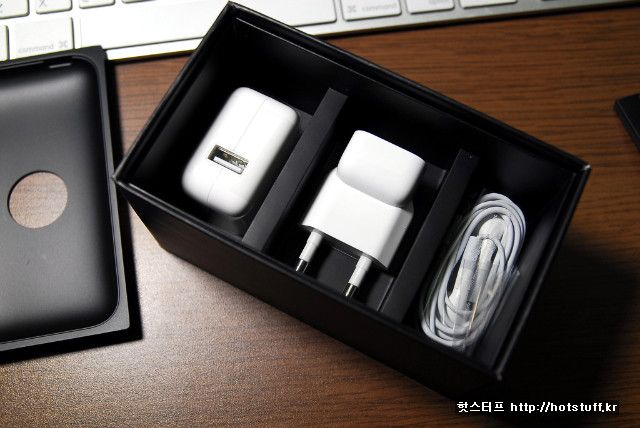 아이폰은 왼쪽 플라스틱 케이스에 잘 담겨 있습니다. 그 케이스를 들어내면 사용설명서 등이 들어있는 작은 패키지가 나오고 그 패키지 아래쪽에 세부적인 구성품을 볼 수 있죠. 국내 휴대폰을 구입하면 케이스가 넘치도록 액세서리가 구비된 것을 생각해보면 아이폰의 구성품은 상당히 단순합니다. 적어도 융이라든지 파우치 하나쯤은 넣어놨으면 좋겠다는 욕심이 생기는 순간입니다. 구성품으로는 USB단자가 구성된 전원어댑터와 220V 플러그, 그리고 번들 이어폰과 USB 케이블 등으로 구성되어 있습니다.