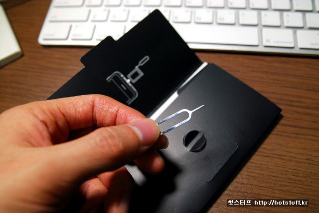 내부의 설명서 패키지에는 USIM 카드커버를 제거하는 클립이 마련되어 있습니다. 이 클립을 아이폰의 위쪽 홈에 밀어 넣어 USIM을 분리하는 구조입니다. 초기에 개통시 한번쯤 꼭 사용해야 하는 파트죠. KT에서는 예판자에게 보낸 이미지로 이 클립 대신 일반 클립을 펴서 사용하는 설명서 사진을 넣어주는 바람에 빈축을 사기도 했습니다. 여튼 좀 더 나은 구성품을 주는 것은 좋은 일이지요.