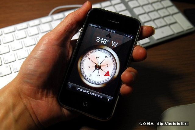 3GS에서 추가된 나침반 기능입니다. 나침반을 휴대폰에 접목했다는 것도 독특하지만 움직임이라든지 아래쪽 아이콘을 선택해서 지도 등을 보거나 경로를 검색할 수 있는 등의 기능 또한 매력적입니다.