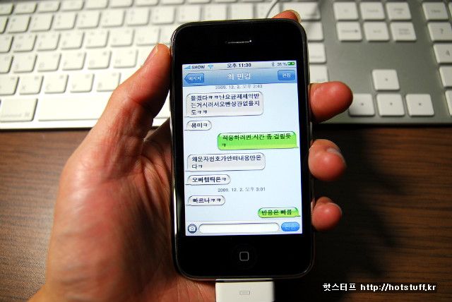 개인적으로 아이폰에 거는 가장 큰 기대는 통합메세징서비스를 버릴 수 있다는 점이었습니다. 아이폰은 느리고 불편한데다가 휴대폰의 UI와 어울리지 않는 통합메세징이 들어가지 않았습니다. 덕분에 아이폰의 효율적인 UI를 활용하며 마치 채팅을 하는 듯 한 메세징 환경의 구현이 가능합니다. 문자를 보내다 보면 어느새 십수건 이상 보내며 채팅을 하고 있는 자신을 발견할 수 있습니다-_-; 아이폰 유저들은 문자요금에 항상 신경을 써야 겠습니다.