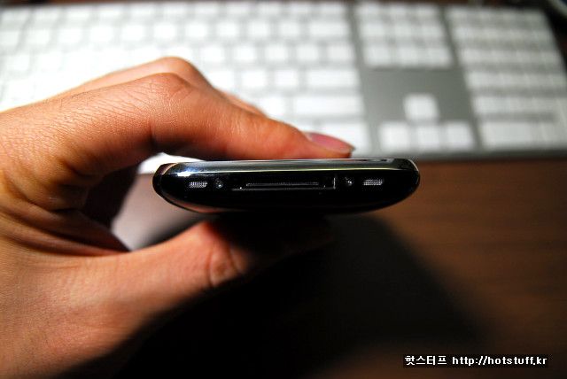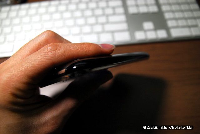 두께는 그리 두껍지 않습니다. 햅틱2를 쥐었다가 아이폰을 쥐었을때 상당히 슬림한 느낌을 받았습니다. 일단 두께도 두께지만 모서리쪽으로 갈수록 얇아지는 디자인도 한몫했다는 생각이 듭니다. 덕분에 그립감도 좀 더 좋습니다.