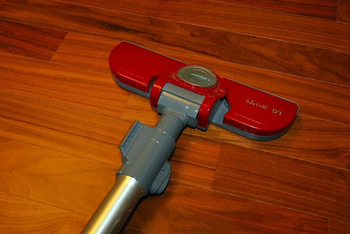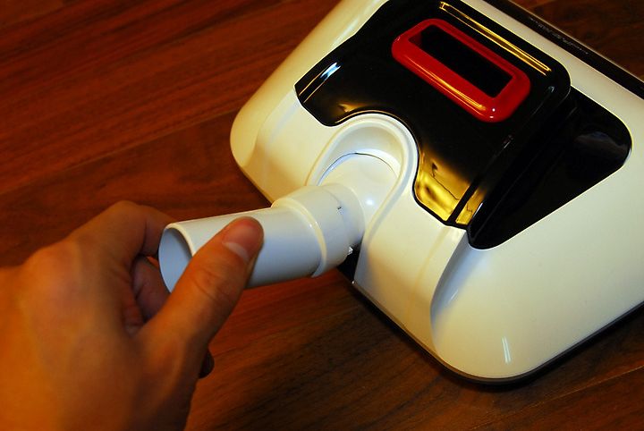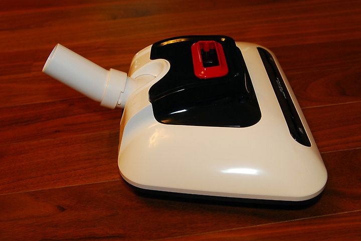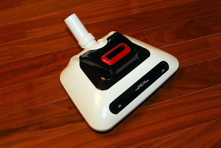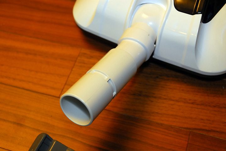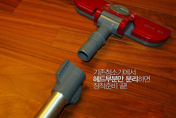 이번에 수고해 줄 청소기입니다. 일반적인 청소기용 헤드가 장착되어 있는 모습입니다. 이런 구조의 청소기는 헤드를 붙들고 있는 봉 부분에 헤드를 뺄 수 있는 버튼이 구성되어 있는데요, 이 버튼을 눌러서 헤드를 완전히 빼내면 장착이 준비된 겁니다.
