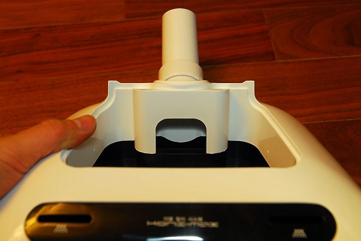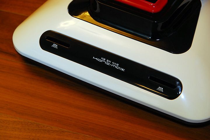 앞쪽에는 2개의 흡입구가 있습니다. 우선 바닥면에 있는 흡입구가 침구 등에 밀착해서 먼지나 이물질을 빨아들이는 역할을 한다면 이 부분은 공기를 흡입하는 역할과 더불어 청소기가 이동하면서 생긴 먼지 등을 다시한번 빨아들이는 역할도 하는 부분으로 보여집니다.