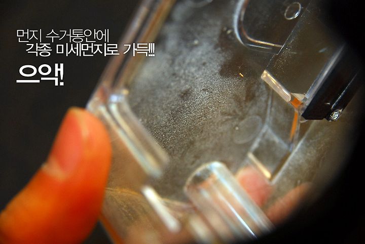 뒤집어보니 예상대로 상태가 심각합니다. 수거통안은 이미 매케하게 먼지로 가득찼고 머리카락은 물론 심지어 군데군데 큼직한 이물질까지 보입니다. 안쪽을 더 들여다 보니 수거통안벽쪽으로 먼지득이 그득하게 쌓인 모습입니다.
