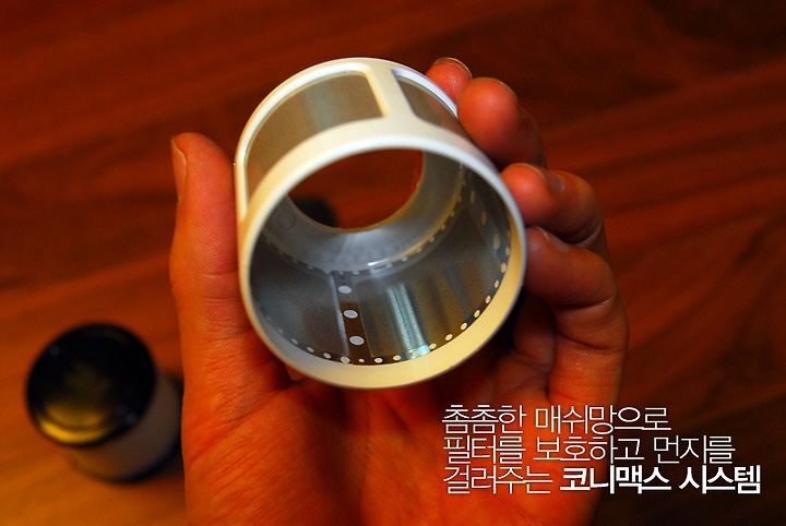 조립은 분해의 역순입니다. 이처럼 내부필터를 매쉬필터에 쏙 집어넣고,