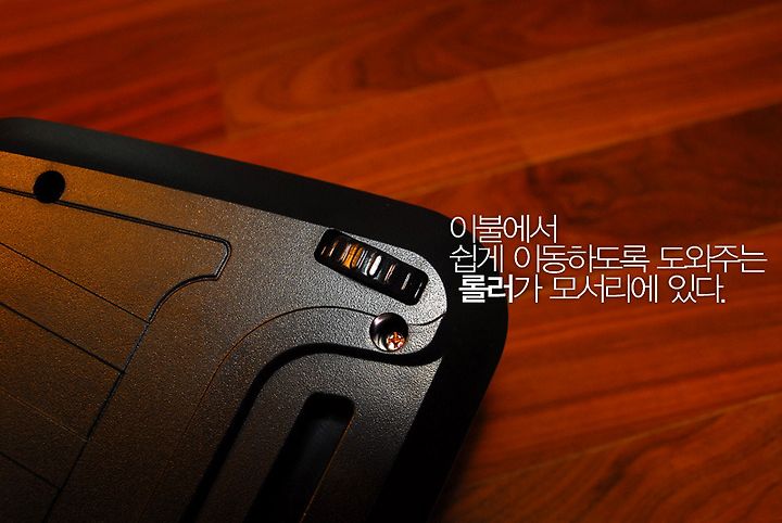 특히 왼쪽과 오른쪽 모서리에는 이불이나 카페트 등에서 쉽게 이동이 가능하도록 돌기처리가 된 2개의 롤러가 장착되어 있습니다. 덕분에 요리조리 밀고 당기는데는 수월한 느낌을 전합니다.