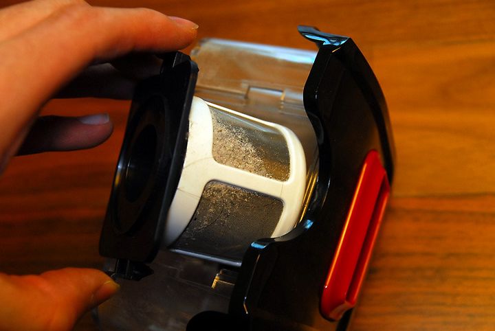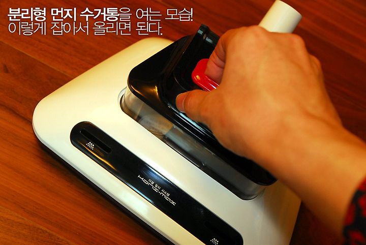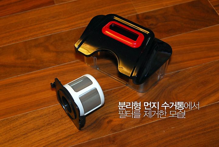 분리형 먼지 수거통은 위쪽의 빨간 손잡이 부분을 잡아 당겨 손쉽게 분리가 됩니다.