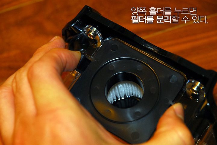 필터를 분리하는 법은 그리 어렵지 않습니다. 필터홀더의 양쪽에 위치한 홀더를 눌러서 당기면 필터를 분리할 수 있습니다.