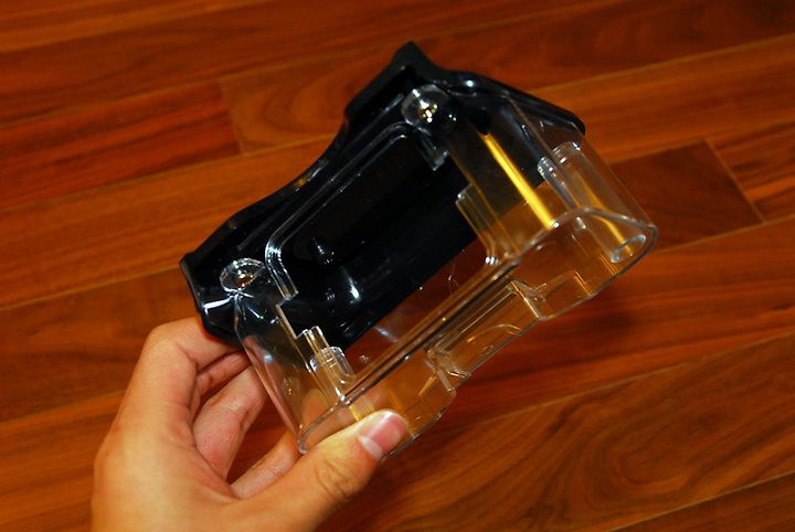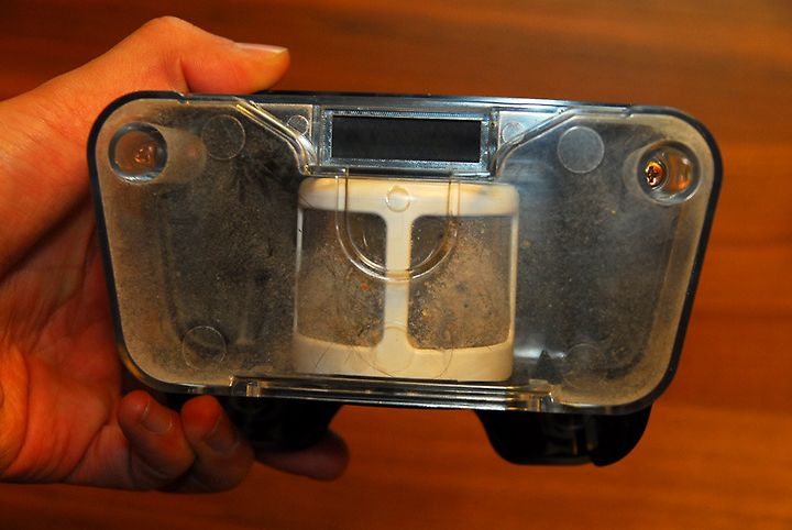 수거통이 완전히 분리된 모습입니다. 통은 전체적으로는 투명한 소재로 만들어져 있어 얼만큼의 먼지가 담겼는지 바로 확인하고 청소할 수 있으며, 필터만 제거하면 씻어서 사용해도 됩니다.